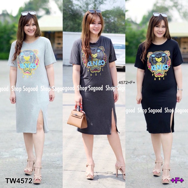 เดรสยาว # สาวอวบ 5 ส่วน ผ้ายืดเรย่อนเนื้อดี สกรีนลาย เสือ Kenzo ผ่าหน้า งานสวย ใส่ได้หลายโอกาส