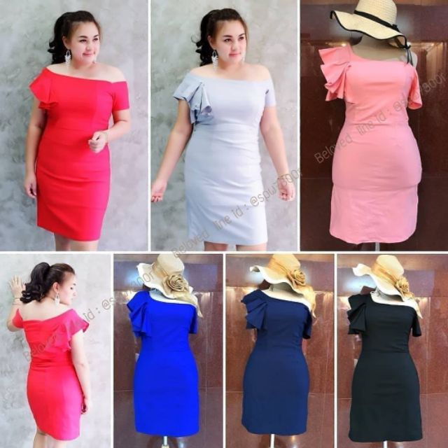 เดรสทรงปาดไหล่ไซส์ใหญ่ แต่งระบาย แขนงานเข้ารูปสวย