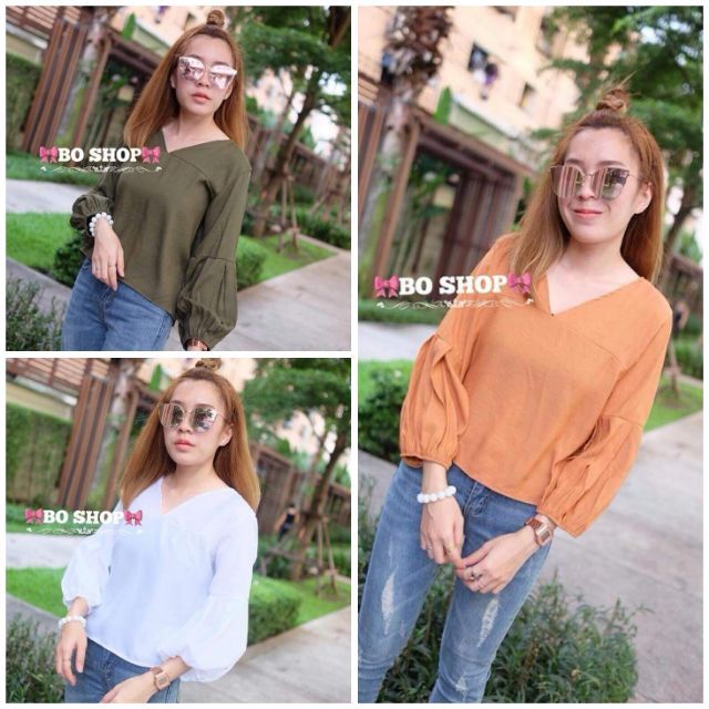 เสื้อคอวีต่อเเขนบอลลูนสีพื้นเรียบหรูดูดี