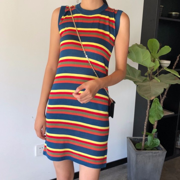 | EASON-SHOPGU7985จริงนัดตีย้อนยุคสีลายชุดชุดถักคอกลม แขนกุดกับผู้หญิงที่อยู่ในใกล้กระโปรงยืดชุดกระโปรงเข่าสลิม |