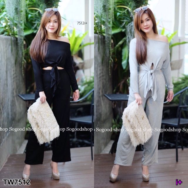 | กางเกง เสื้อปาดไหล่ แขนยาว + - ขายาว ทรงกระบอกเล็ก Set2ชิ้น # สาวอวบ ผูกโบว์หน้า |