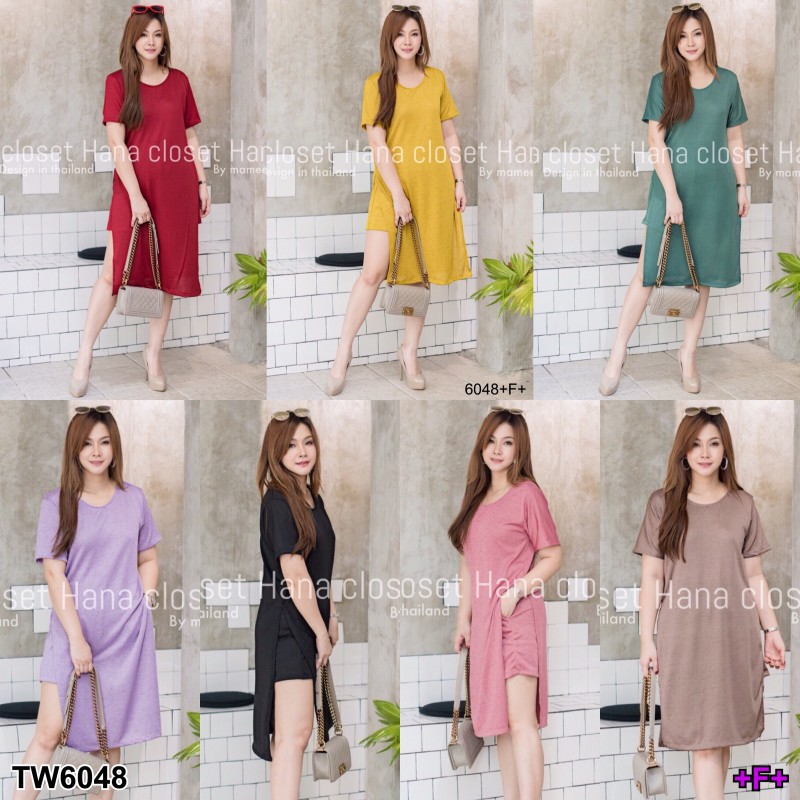 | Set เสื้อคอกลมตัวยาวผ่าข้างสองฝั่ง # 6048 ส่งไว เอวสม้อค งานสวย ขาสั้น มาคู่กับกางเกง สาวอวบ |