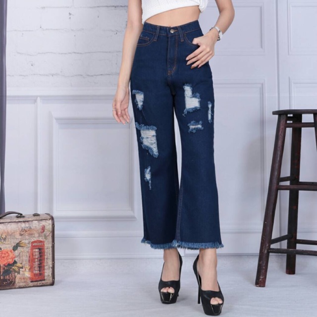 มี2สี กางเกงยีนส์ ขากระบอก แต่ง ขาด ปลายลุ่ย ไซส์ใหญ่ สาวอวบ สาวอ้วน PlusSize