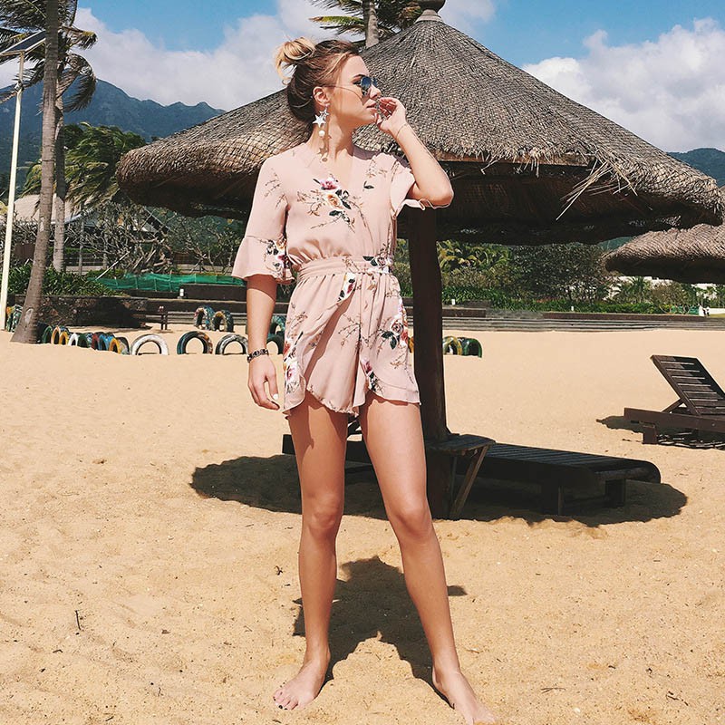 ชุดจั๊มสูท ขาสั้นคอวี พิมพ์ลายดอกไม้แฟชั่นสตรี