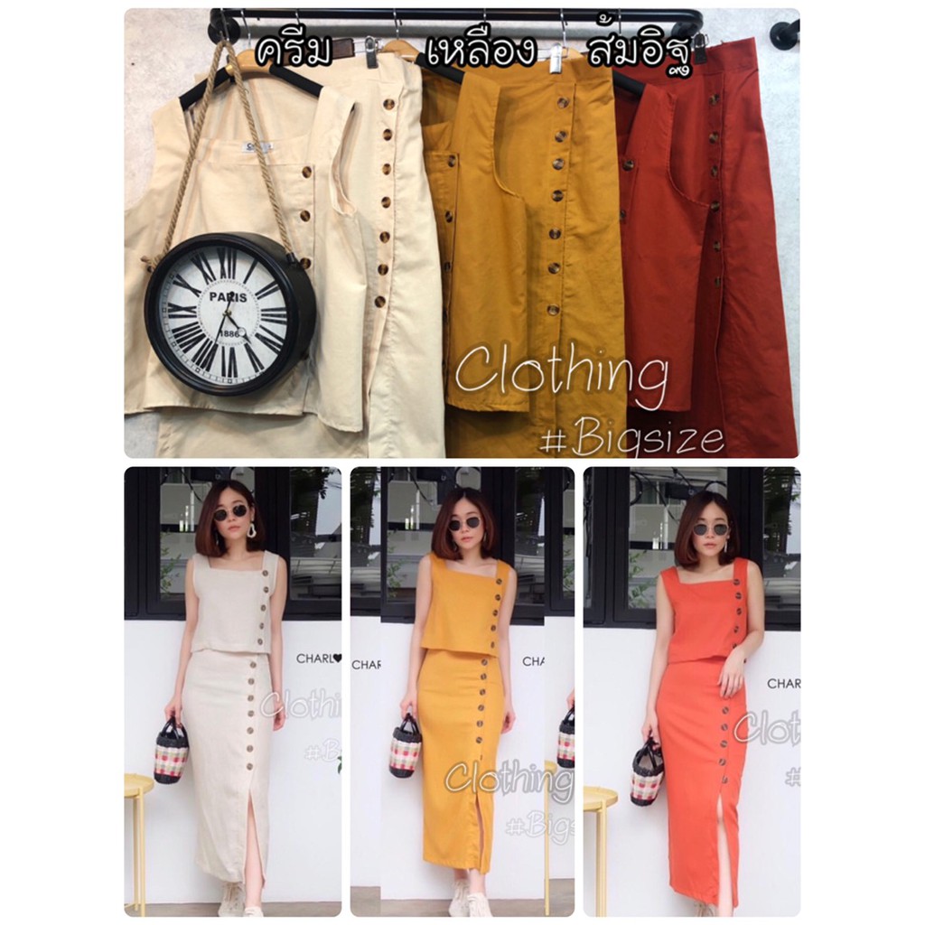 เสื้อ ผ้า สาวอวบ เซตเสื้อแมทซ์คู่กับกระโปรง แต่งกระดุม