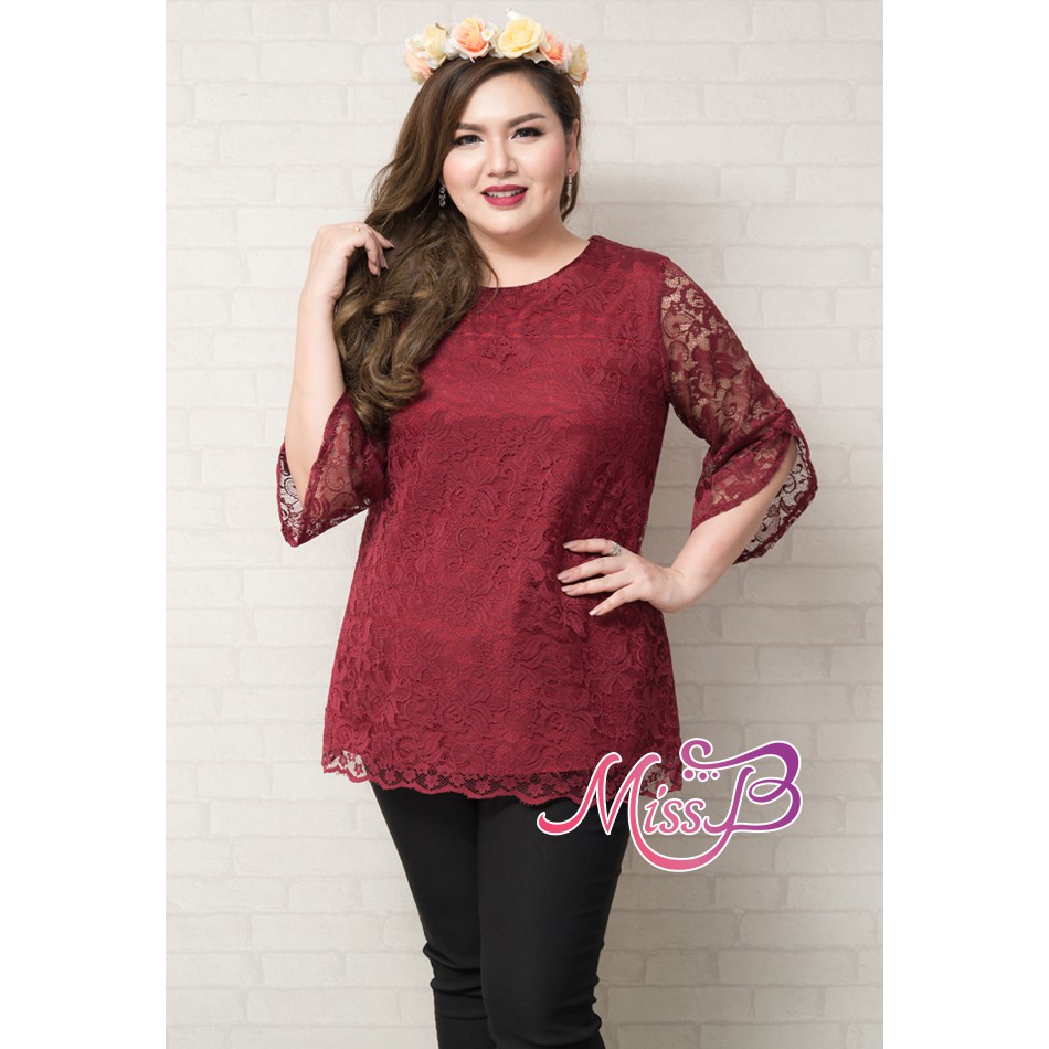 แดง/กรม/ชมพู/ ขาว/ดำเสื้อลูกไม้ไซส์ใหญ่ แขนสี่ส่วนลายดอกไม้แต่งปลาย แขนป้ายทับ