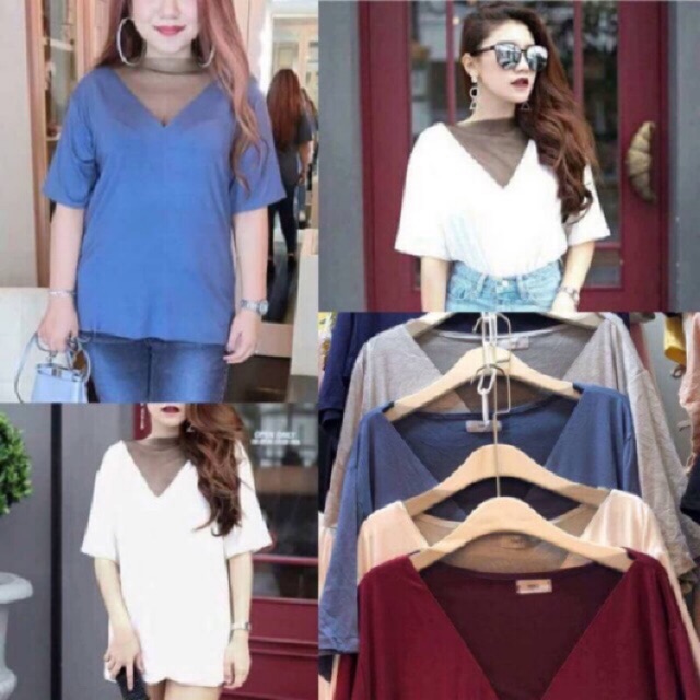 เสื้อ สาวอวบคอวี แต่งตาข่ายที่คอ ผ้าเรย่อน อก48 ลดราคา ชุดคนอ้วน ถูก ชุด