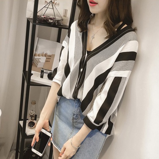 เสื้อ สาวอวบลายทาง คอวี ผ่ากระดุมหน้า