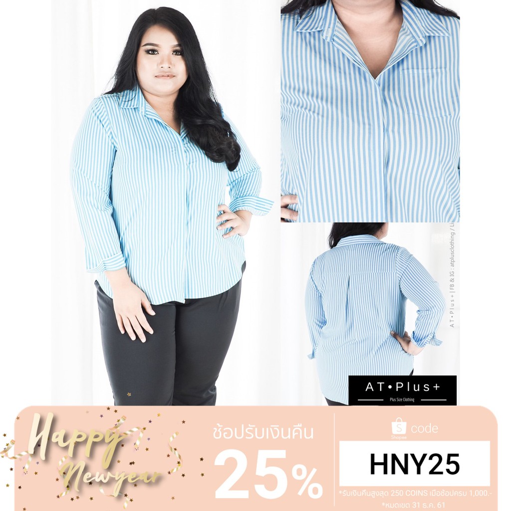 | เสื้อเชิ๊ตผ้าไหมอิตาลี 56 เสื้อผ้าไซส์ใหญ่ ลายทางสีขาวฟ้า รอบอก - นิ้ว เสื้อสาวอวบ : เสื้อผ้าคนอ้วน B0093 |