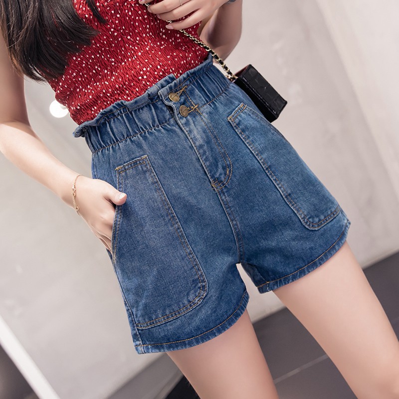 สปอตกางเกง ขาสั้นกางเกงยีนส์ เอวelasticated ขนาดใหญ่กางเกงยีนส์ ขายาว เอวยาวกางเกง ขาสั้นนักเรียนกางเกงยีนส์ยืดเส้นตรงลำลองก